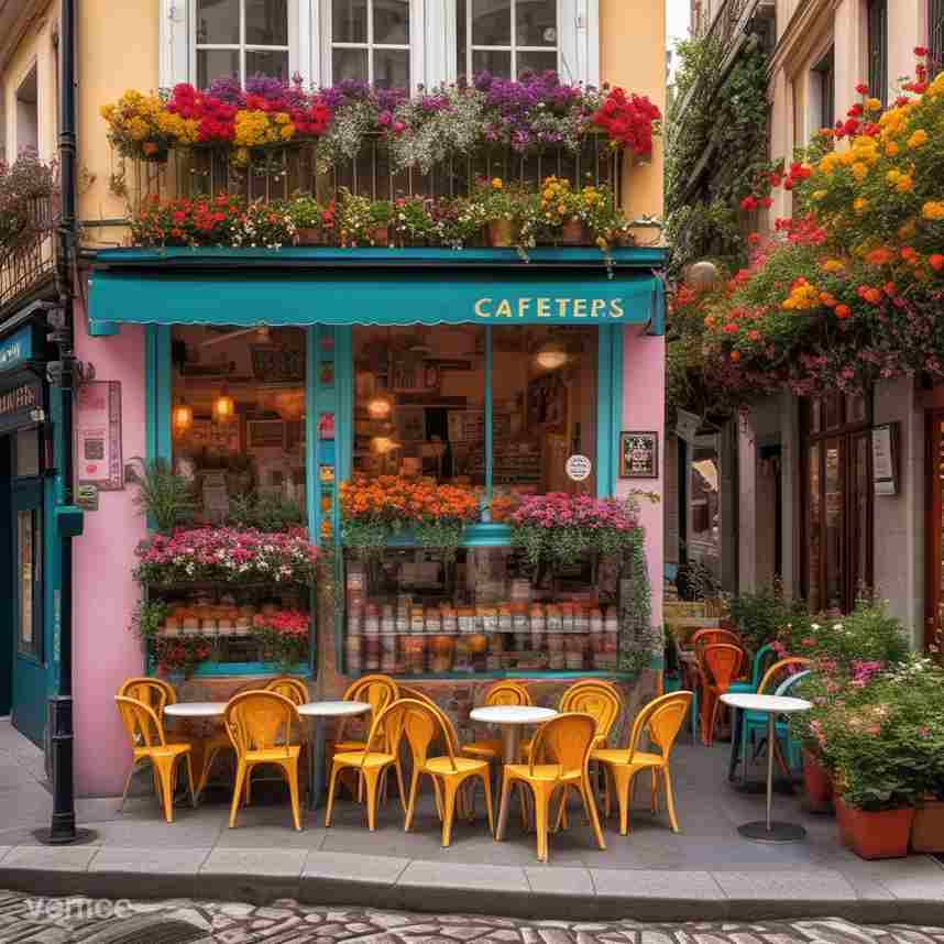 “I would like an illustration of a cozy café located on a cobblestone street corner in a quaint European town. The façade should feature warm colors with large windows and a terrace overflowing with flowers. I envision vintage-style tables and chairs adorned with red and white checkered tablecloths. There should be steaming coffee cups on some of the tables and people enjoying the ambiance. The sky is clear, reflecting a light blue in the windows, with an antique bicycle leaning against the entrance.”