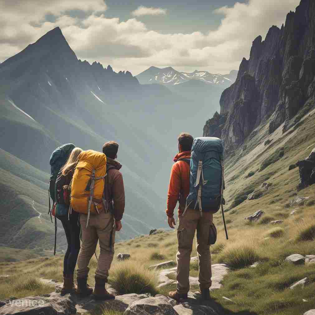 “I want to create an image that depicts an outdoor adventure scene. The image should show a group of three explorers (two men and one woman) climbing a rocky mountain on a sunny day. They should have large backpacks, colorful hiking gear, and be gazing at a beautiful valley filled with green trees and a winding river. The sky should feature a few fluffy white clouds and birds flying. The atmosphere should be vibrant and full of energy, symbolizing the thrill of exploration.”
