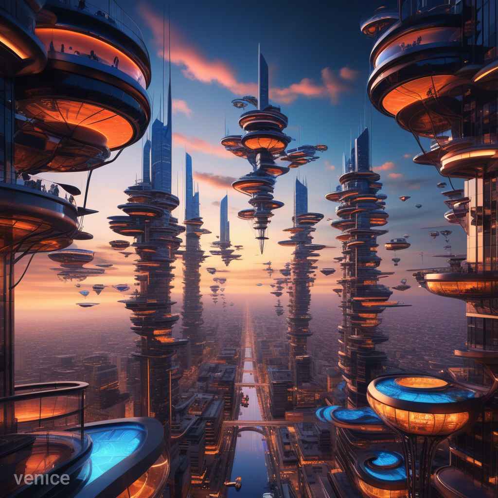 “Generate a futuristic landscape featuring tall glass skyscrapers, flying vehicles in the sky, an orange sunset, and neon lights in shades of purple and blue reflecting on the streets.”