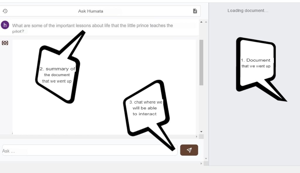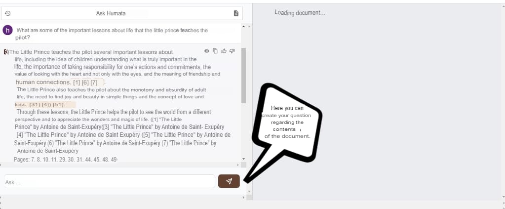 When the document is uploaded, a summary will appear on the left side of the screen, and a chat window will appear at the bottom, allowing us to ask questions or request information about the document. For example, if I upload the “Little Prince” book and I want to know why the “Little Prince was six years old”, I simply type the question in the chat, and the AI will automatically interpret and provide the answer to my query regarding the book.