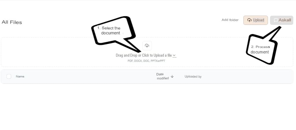 2. Once the document is uploaded, wait for the 'Ask all' button to become active in the upper right corner of the screen. Click on it to process the document, and that's it!